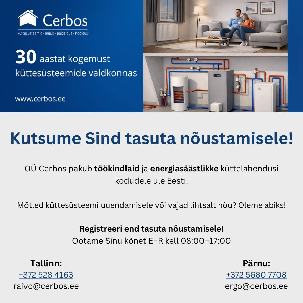 Alates 1996. aastast tegutsedes toome kokku laia tootevaliku ja praktilise teeninduse — see ühendus võimaldab kiiremat tarne‑ ja remonditööd ning lihtsamat suhtlust projekteerimisest kuni hoolduseni. Meie lähenemine on käed‑külge, tehniline ja usaldusväärne: eesmärk on hoida süsteemid töövalmis, vähendada seisakuid ja aidata hoida küttekulud kontrolli all.