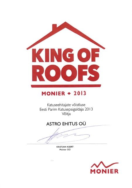 Meid iseloomustab aastatepikkune kogemus, mis on kasvanud välja järjepidevast tööst alates 1997. aastast. Oleme Ruukki ja Monieri ametlik partner ning kuulume Eesti Katuse- ja Fassaadimeistrite Liitu. Meie tööd on pälvinud tunnustust katusepaigalduse kvaliteedi eest, kuid meie jaoks on kõige olulisem, et iga projekt oleks tehtud hoolikalt, vastutustundlikult ja hoone vajadusi arvestades.