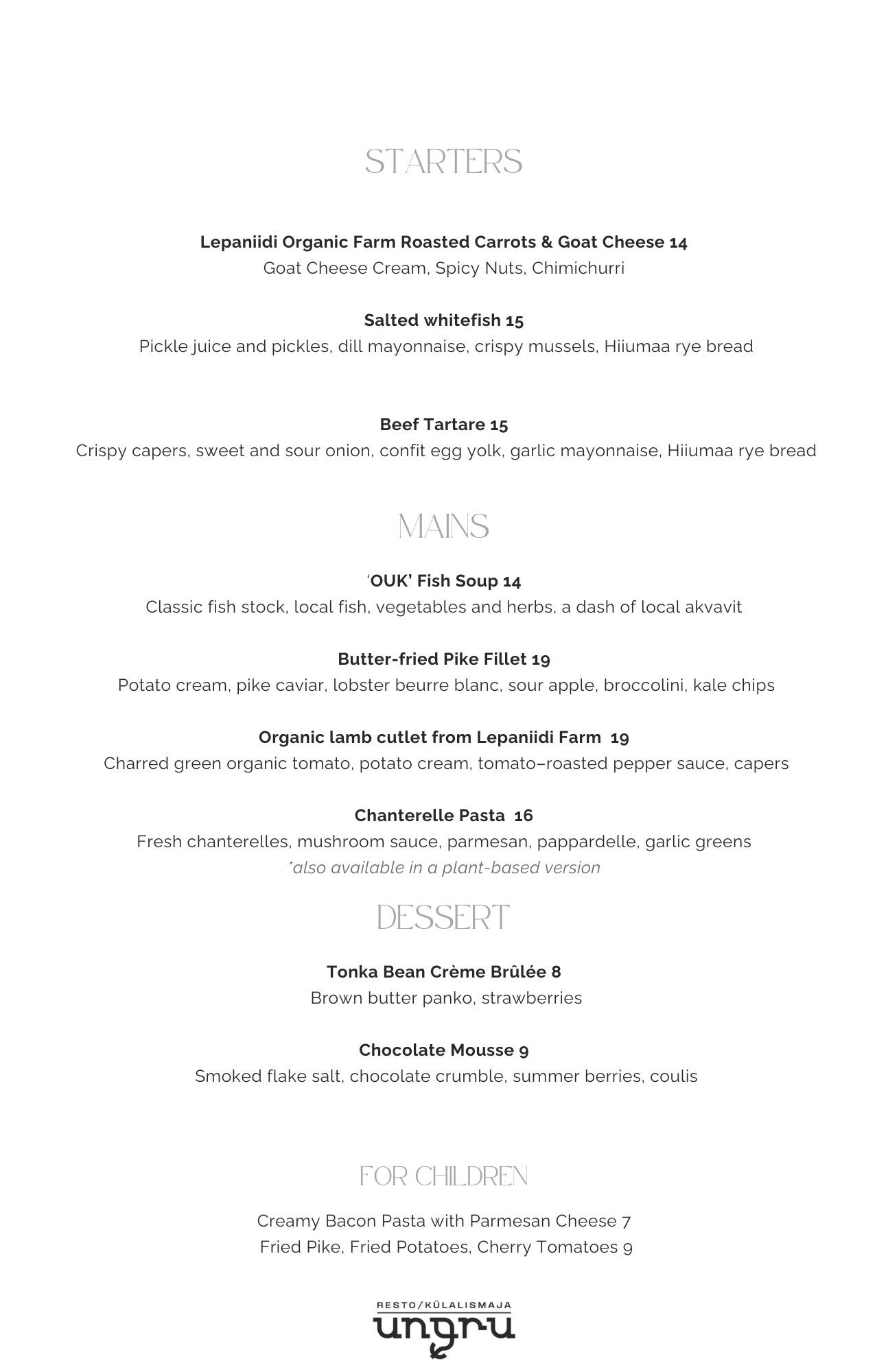 Restoranis pakume hooajalist menüüd, mis saab inspiratsiooni Hiiumaa toorainest ja kaasaegsest toiduvalmistamisest. Külalistemaja loob aastaringselt võimaluse ööbida mere ääres privaatses ja rahulikus keskkonnas ning catering aitab korraldada toidu nii väiksematele kui ka suurematele sündmustele vastavalt nende iseloomule.