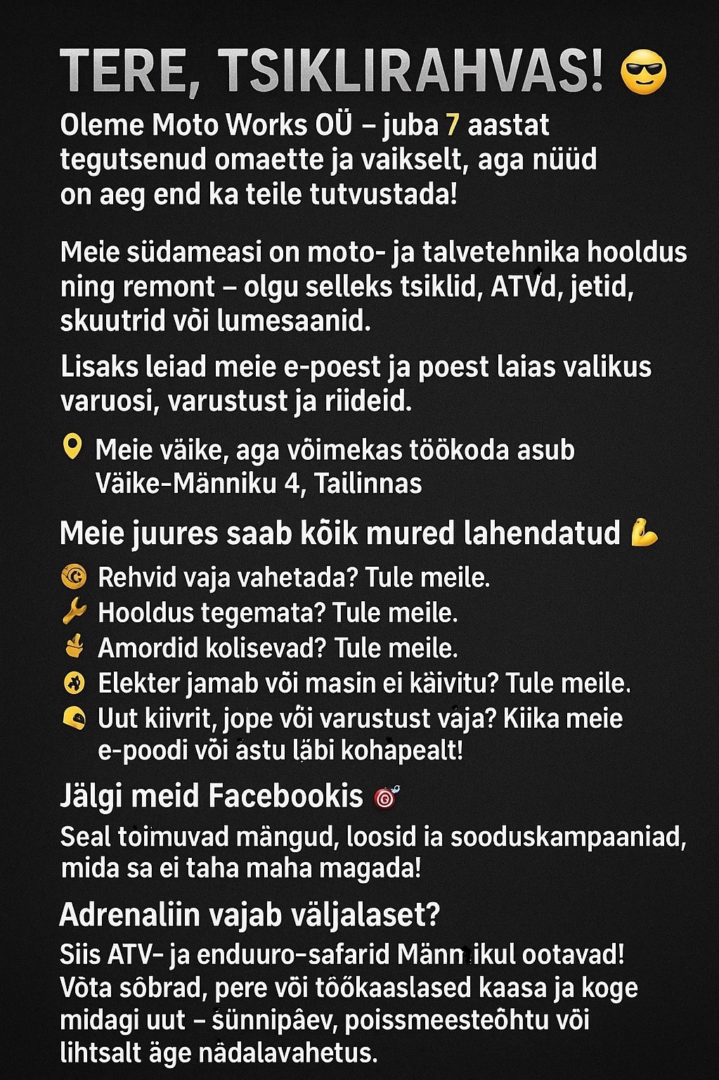 Meie töö on toetada mootorspordi- ja vabaajakasutajaid nii argipäevahingeks kui rajal sõitmiseks: tagada sõidukite töökindlus, pakkuda praktilist nõu ja hoida kogukond koos. Läheneme igale masinale ja inimesega avatult ja asjatundlikult, et sõitja saaks keskenduda sõidule, mitte muredele.