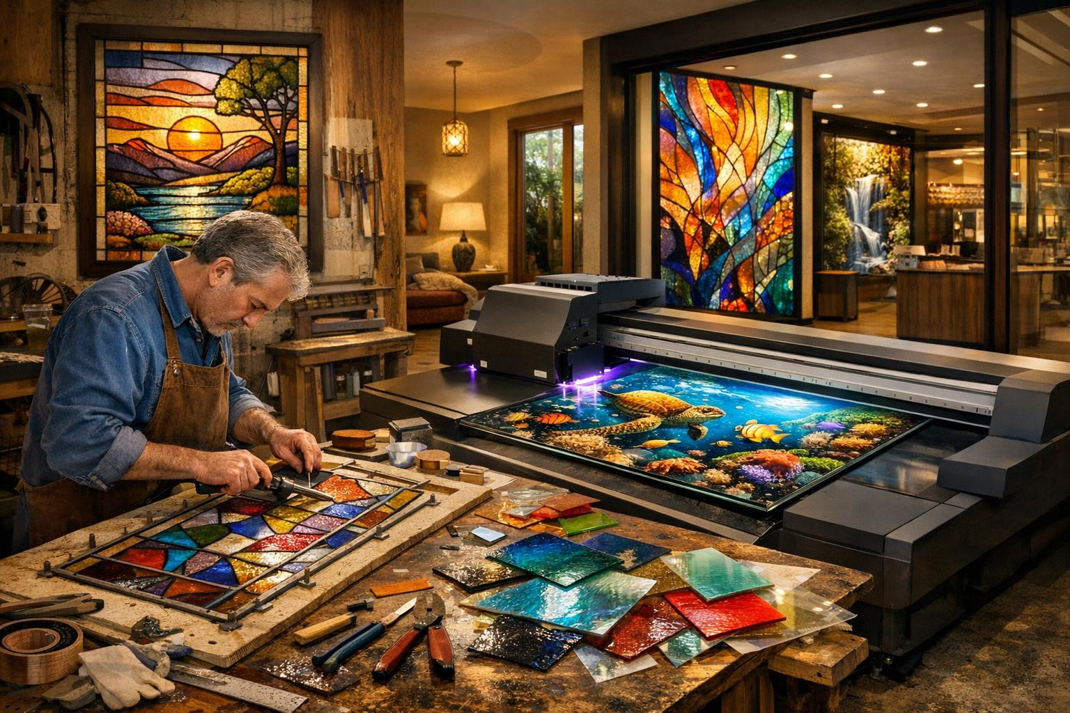 Me ühendame vitraažikäsitöö traditsioonid ja tänased trükivõimalused, et pakkuda klaasile lahendusi, mis annavad ruumile isikupära ja mängu valgusega.