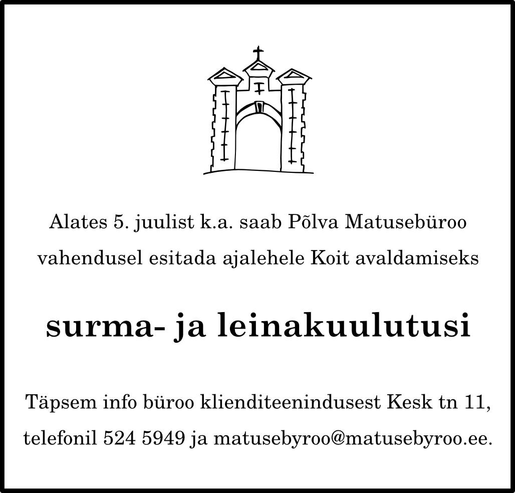 Põlva Matusebüroo OÜ oli minu perele suureks toeks meie rasketel aegadel. Suurepärane teenindus ja empaatiline suhtumine.