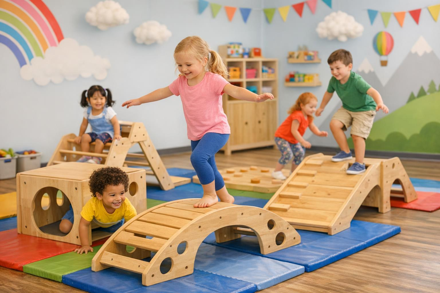 Kasutame lasteaia rühmas suuremotoorika mängumooduleid; tasakaalu- ja koordinatsiooniharjutused on muutnud päevad aktiivsemaks ning lapsed tunnevad end seal turvaliselt.