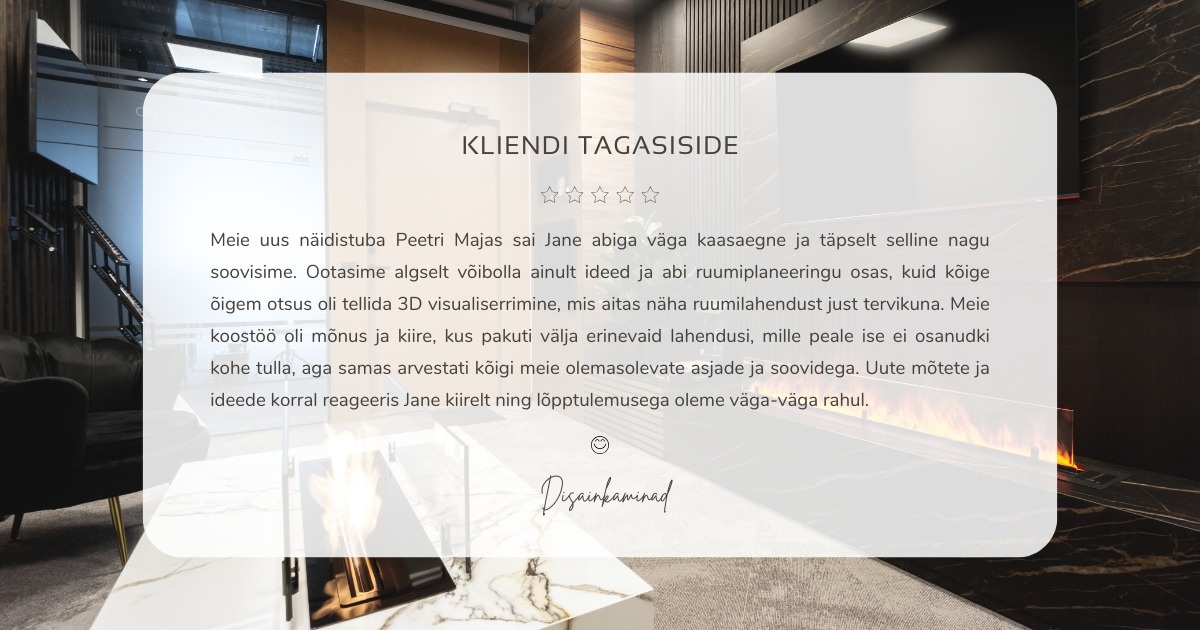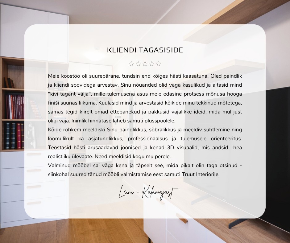Tellisin täieliku sisekujunduse koos eritellimusmööbli ja projektijuhiga — nad koordineerisid teostuse ja hoidsid eelarvet, tulemuseks praktiline ja stiilne kodu.